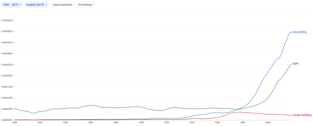 Once upon a time, in the 1970s, model building gained popularity and nearly caught up with the older art of storytelling. But half a century later the popularity of model building is back to what it was in the 1960s, and according to the data analysis by Google Ngram “storytelling” has reached new heights, the word being used twice as often as the word “agile”.