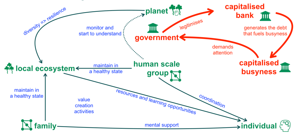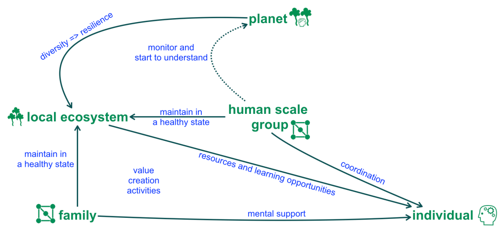 Individual social agents (organisms) are not only participants in a system, within ecological and biological processes they are also complex systems themselves, resulting in a structure of nested systems. For example, a mammal can be understood as a collection of interacting subsystems, i.e. the circulatory system, the nervous system, the mental system (all the mental models of the environment), the digestive system, etc. Each of these subsystem consists of specific agents (organs and cells). Whilst Luhmann’s theory could be used to describe the communication between these systems in abstract terms, evolutionary design is also equipped to describe the communication between specific organs and cells, and allows us to take a holistic approach to human wellbeing at human scale that is compatible with our evolutionary history.