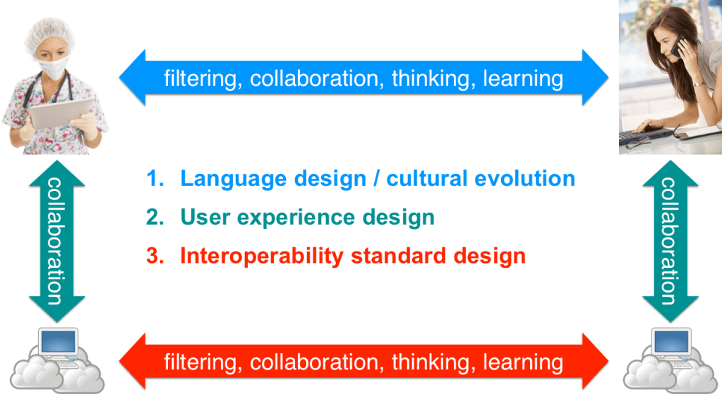 In Evolutionary design the focus is on communication between concrete social agents, specifically on the evolution of shared understanding and knowledge co-creation, recognising that knowledge may pertain to the system or to the environment, and that the internal models that agents maintain act as the semantic integration points between systems. Many of these semantic integrations are not visible as explicit communication but show up in the form of tacit knowledge, i.e. as unobservable and often subconscious processes within each social agent.